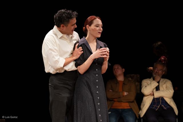 Consiste en una puesta en escena propuesta en dos tiempo de 180 minutos que pasan sin sentir, pues reúne muchos elementos interesantes a considerar. La obra montada con un solo cuadro escenográfico, muestra varios objetos de utilería como los son un árbol seco, pétalos, algunos asientos, una mesita con una jarra con agua fresca,  y varios vasos.