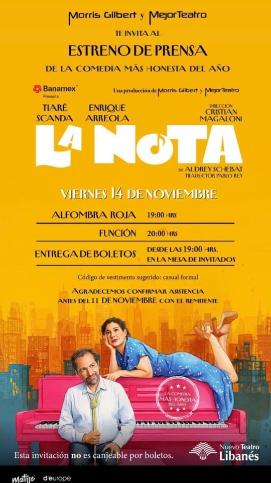 Bajo la gran dirección artística de Cristian Magaloni y con las interpretaciones de dos destacados actores como lo son Tiaré Scanda y Enrique Arroyo, se dio inicio el día de ayer 14 de noviembre a la temporada de representaciones de la obra LA NOTA original de la escritora francesa Audrey Schebat (1973) bajo la traducción de Pablo Rey, presentada por Morris Gilbert y su compañía “Mejor Teatro”.