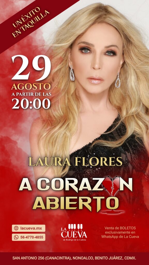 LAURA FLORES como Usted bien sabe, además de ser una talentosa actriz, es poseedora de un colorido de voz que ha cautivado a muchos de sus fans. Por ello le diré como grata noticia qué gracias a su melodiosa voz y a sus fieles seguidores, es que nuevamente tendremos a la cantante LAURA FLORES en el mágico espacio de LA CUEVA DE RODRIGO DE LA CADENA en la Ciudad de México.